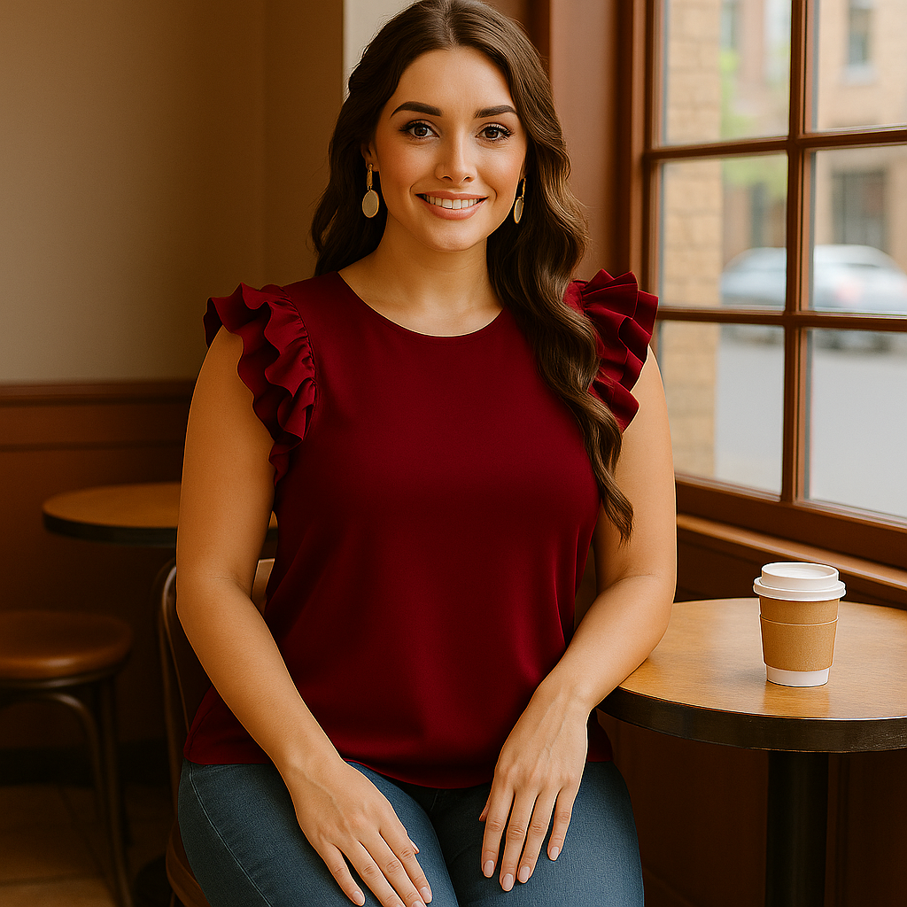 Turn heads with this timeless Amira ruffle blouse — a perfect blend of elegance and confidence. Featuring statement ruffled sleeves and a sleek round neckline, it flatters every silhouette while adding a touch of sophistication. Pair it with jeans, trousers, or shorts for an effortlessly chic look that works from day to night.