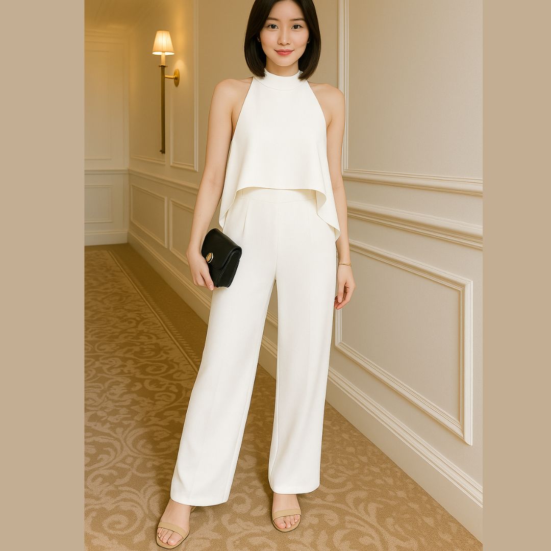 TElevate your wardrobe with this sleek black co-ord set featuring a structured sleeveless wrap blouse and tailored trousers. Designed for timeless sophistication and all-day comfort